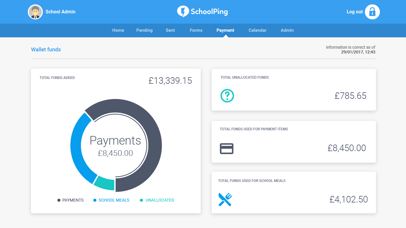 - Total funds used for school meal payments - Total of how much money you have taken from all parents' wallets to pay for school meal items.